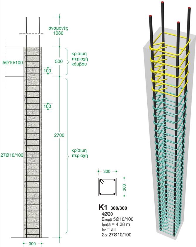 Στην κάθε κρίσιμη περιοχή, έχουν τοποθετηθεί συνδετήρες Ø10/100, ο συνολικός αριθμός των συνδετήρων είναι 6 γι’ αυτό και οι συνδετήρες σ’ αυτή την περιοχή συμβολίζονται ως 6Ø10/100.