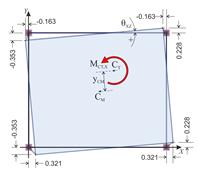 To determine the deformation developed by external moment M, applied at the centre of stiffness CT, the initial system X0Y is transferred (by parallel translation) to the principal system xCTy. The centre of mass is transferred to the principal system along the structural eccentricities eox, eoy in accordance with the following expressions: